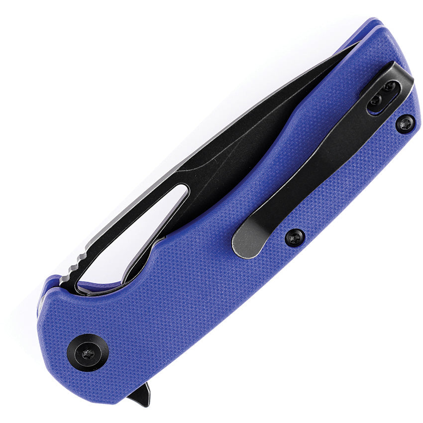 4.5" (11.43cm) closed. 3.5" (8.89cm) black TiNi coated D2 tool steel blade. Blue G10 handle. Thumb pull. Extended tang. Pocket clip. Black nylon pouch. Boxed.