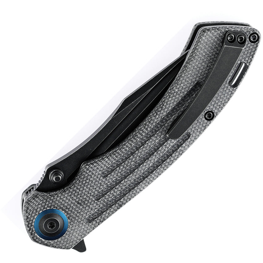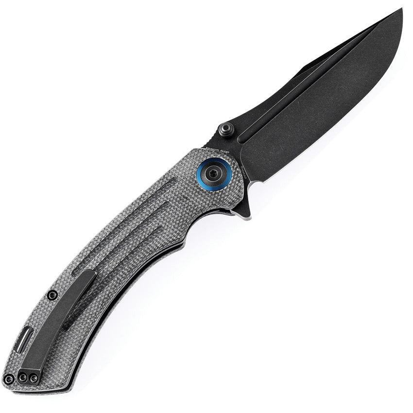 4.75" (12.07cm) closed. 3.5" (8.89cm) black TiNi coated 154CM stainless clip point blade. Black micarta handle. Thumb pull. Extended tang. Lanyard hole. Pocket clip. Black nylon pouch. Boxed.
