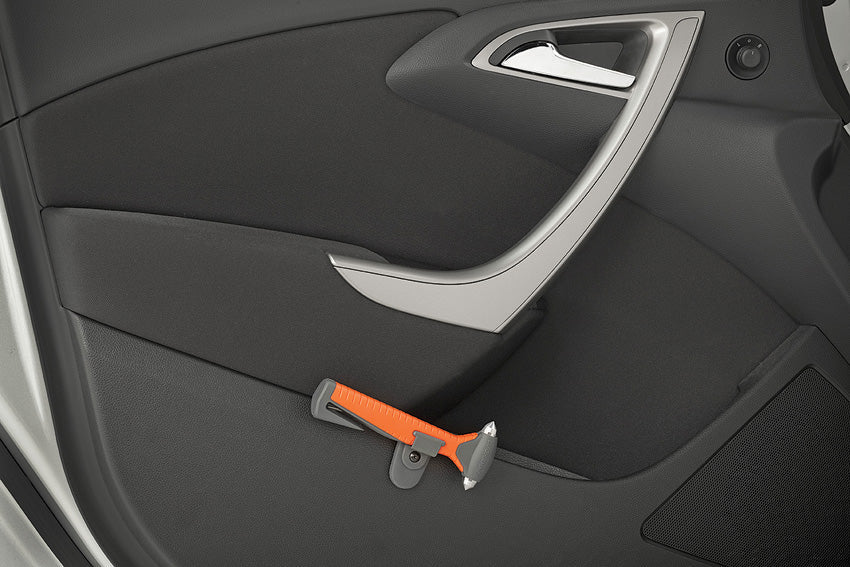 Auto Escape Tool. 7" overall. Designed to help prevent automotive entrapment after an accident. Should power locks become disabled or a safety belt jam after an accident, the double-sided steel spiked hammer heads allow the vehicle occupant to shatter side and rear windows, while a safely concealed razor-sharp blade cuts easily through seatbelts. Orange polypropylene glow in the dark handle. Comes with Quick Click mounting system which allows the hammer to be clipped onto the door with no drilling. The click adapters can be turned 360° to ensure convenient positioning. An additional LifeHammer product can be mounted on the other side of the Quick Click System if desired. Boxed with hanging tab.