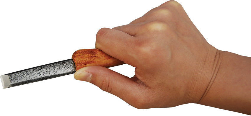 6.00" (15.24cm) overall. 2.25" (5.72cm) stainless blade. Wood handle. Hira single edge blade. Black leather sheath. Hang packaged.