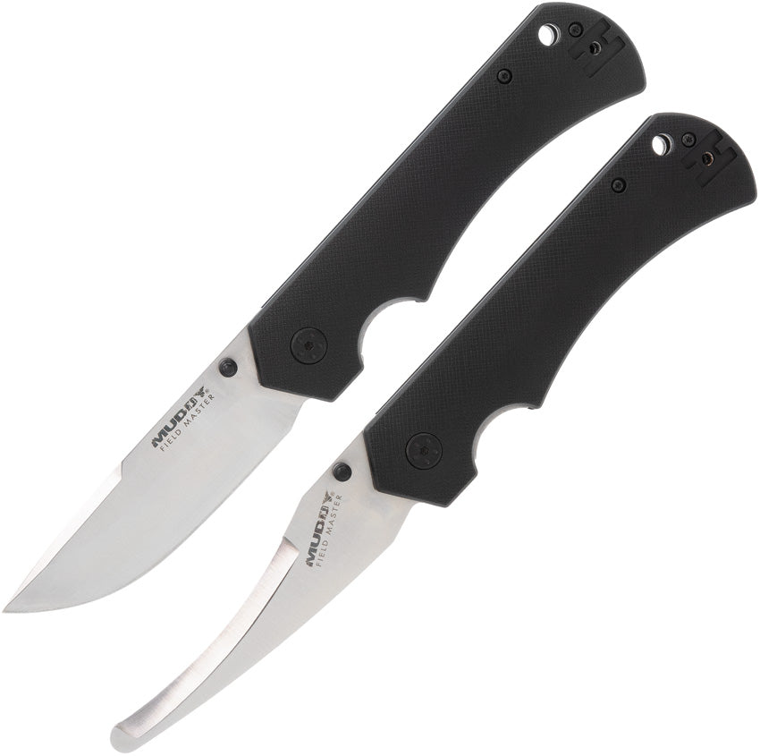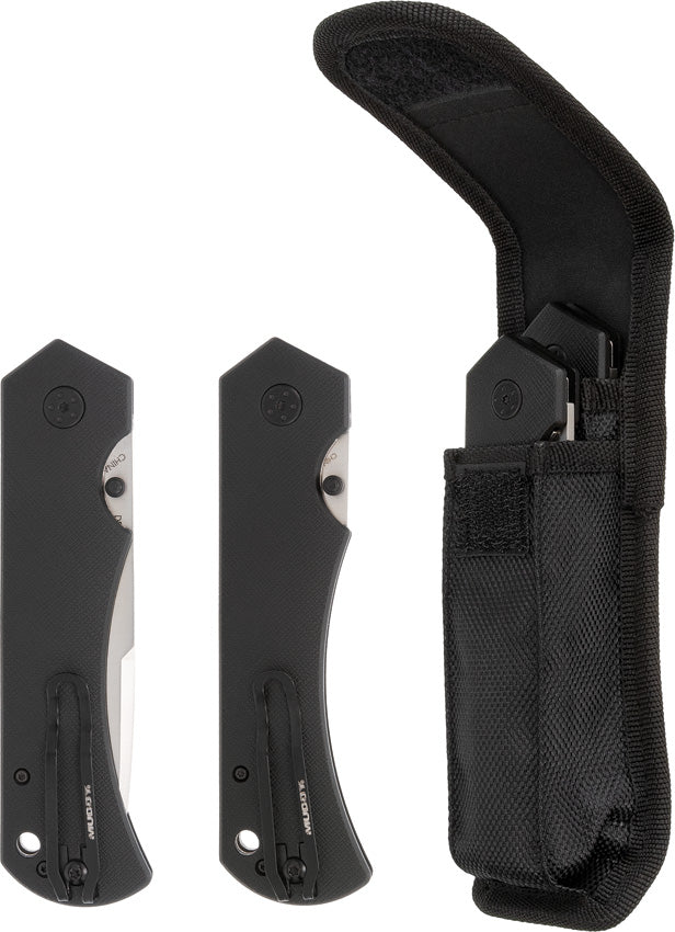 5.5" (13.97cm) overall. Satin finish 440 stainless blade. Black glass filled nylon handle. Thumb stud. Lanyard hole. Pocket clip. Includes: Two linerlock folders: 4" guthook blade; 3.75" drop point blade. Black nylon belt sheath. Clam packed.
