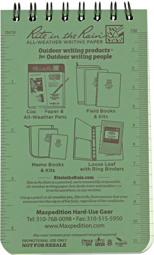 Measures 3" x 5". Page pattern: Universal. Binding: top wire-o spiral. Cover: Polydura. Pages: 50 sheets. "Rite in the Rain" is an all-weather writing paper made specially to shed water in any weather condition. From the jungles in Africa, to Alaskan winters, to the sweat and grime of Iraq, "Rite in the Rain" ensures your data survives! Assorted colors and characters. Strictly our choice!