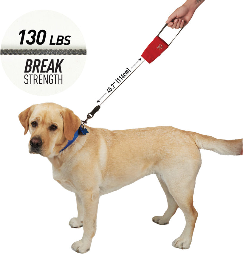 45.7" overall. Durable, washable nylon sleeve. High-quality hardware for secure attachment to collars. Works with dogs of all sizes. Break strength: Large-130 lbs. Hang packaged.