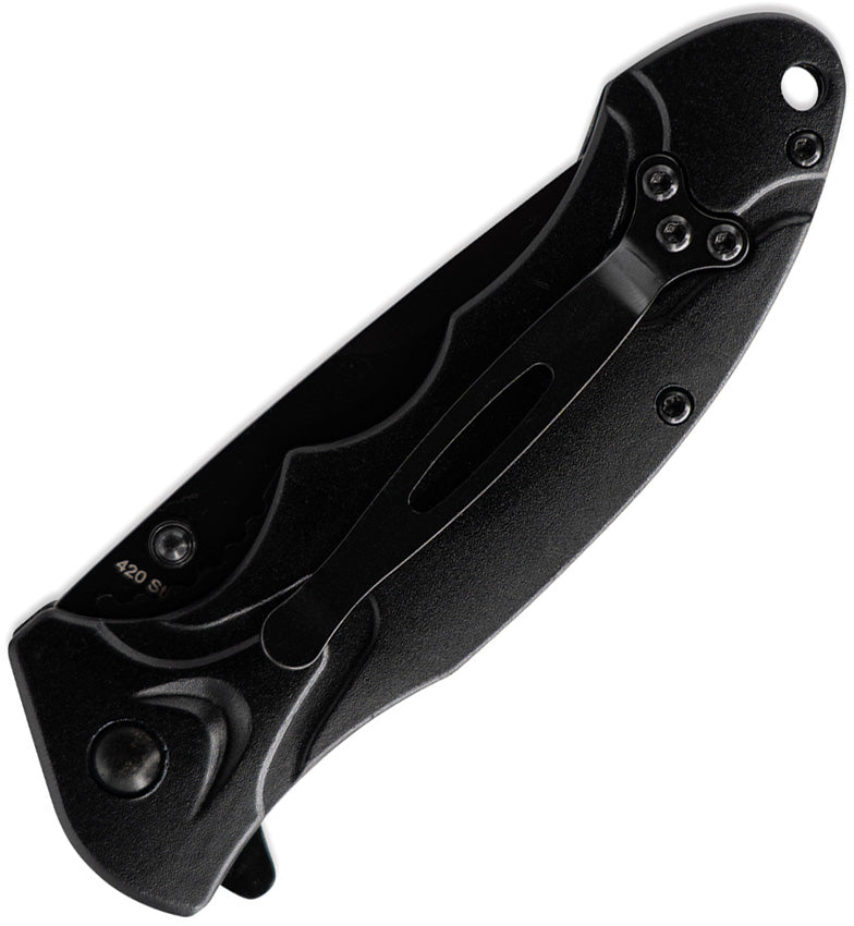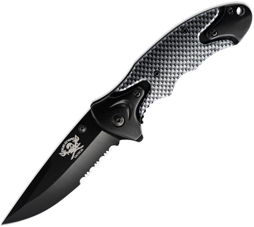 4.5" (11.43cm) closed. 3.75" (9.53cm) black finish partially serrated 420 stainless blade. Black aluminum handle with Faux carbon fiber inlay. Extended tang. Thumb stud. Lanyard hole. Pocket clip. Boxed.