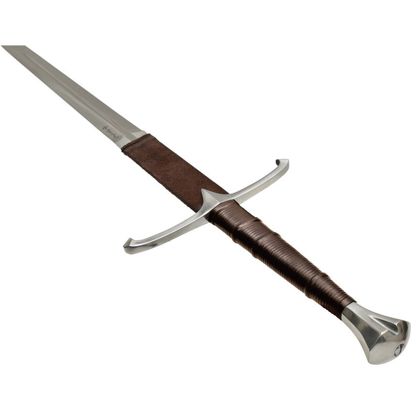 57" (144.78cm) overall. 43.5" (110.49cm) satin finish 1065 carbon steel blade. Steel guard and pommel. Fuller groove. Suede wrap below the hand guard on the blade. Brown leather wrapped wooden handle. Brown leather scabbard. Boxed.