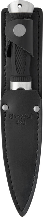 9.63" (24.46cm) overall. 5.38" (13.67cm) satin finish blade. Black TPR handle. Stainless pommel. Lanyard hole. 7Cr13 stainless blade. Sheath with boot clip. Black leather belt sheath. Boxed.