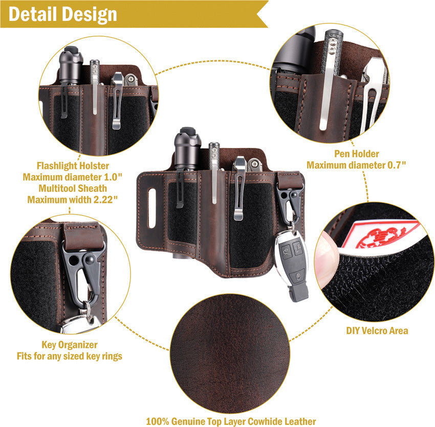 Dimensions: 5.3" x 7.4". Compatible with belts up to 1.77" wide. Tools and gear pictured not included. Bottom of the leather case is sealed with 500D nylon suture. Outer layer is designed with large pieces of Velcro loops. Quick-release key holder. Flashlight/pen pocket; Wide pocket for larger multi tool; Smaller pocket for other EDC items. Crazy Horse leather construction. Color: Dark brown. Bagged.