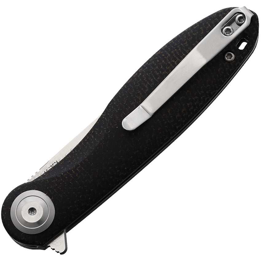 4.13" (10.49cm) closed. 3.13" (7.95cm) satin finish 14C28N Sandvik stainless blade. Black canvas micarta handle. Extended tang. Lanyard hole. Pocket clip. Boxed.