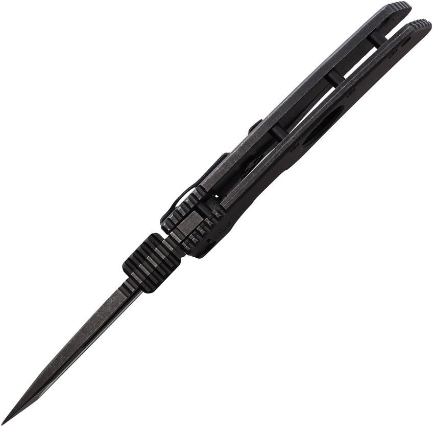 4.75" (12.07cm) closed. 3.5" (8.89cm) black stonewash finish D2 tool steel tanto blade. Black stonewash finish stainless handle. Thumb disk. Lanyard hole. Pocket clip. Black nylon zippered storage case. Boxed.