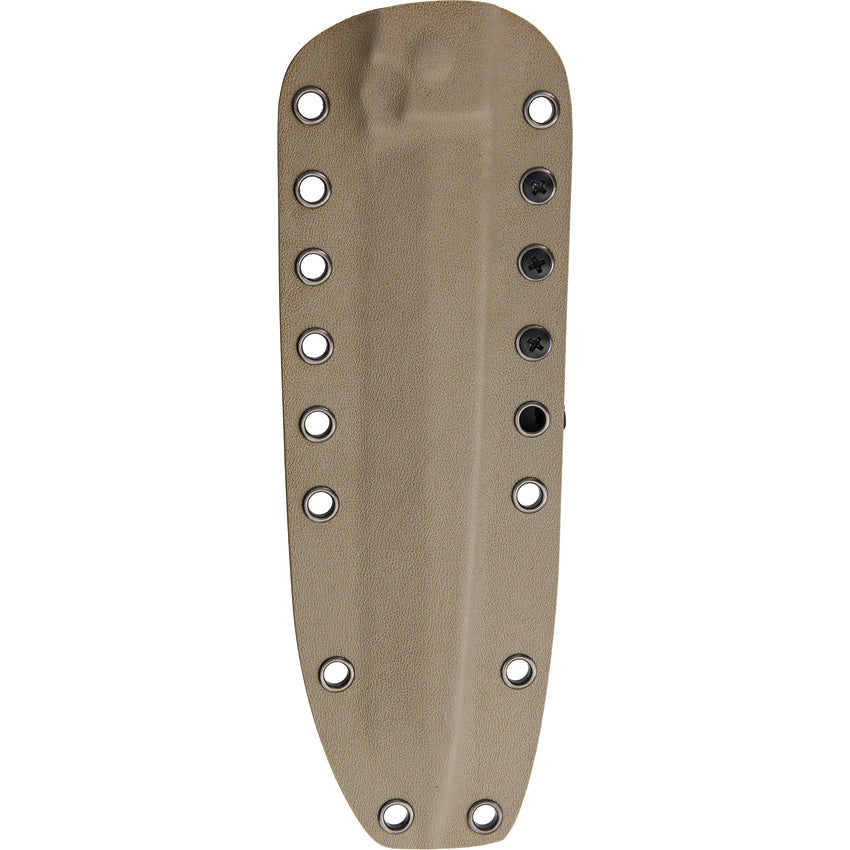 11 7/8" overall. 7" black stonewash finish 440C stainless drop point tanto blade. Full tang. Khaki ergonomic G-10 "Grippy" handles with Index Divots. Includes khaki Click-Lok Kydex sheath with ambidextrous belt mount. Designed by Brian Hoffner, renowned Defensive Knife Trainer.