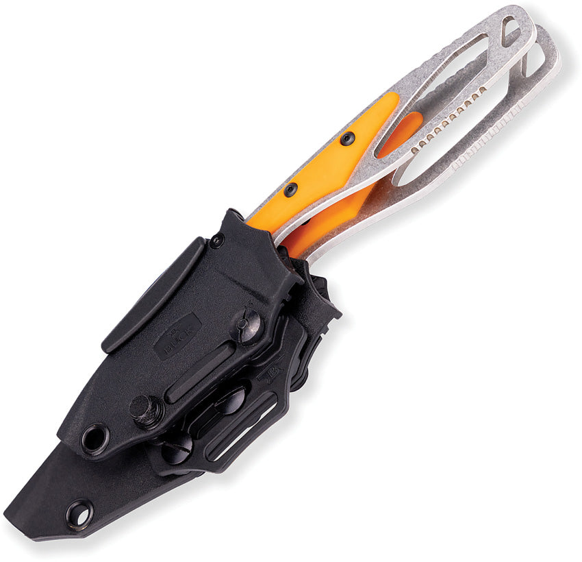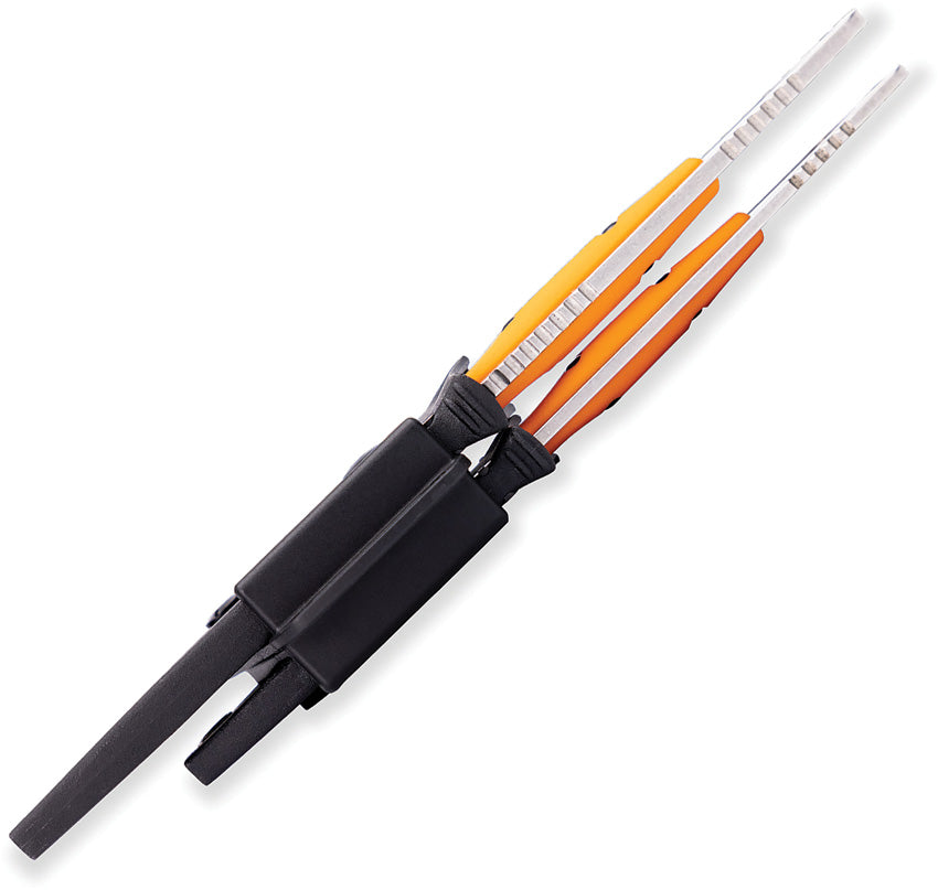 Stonewash finish 420HC stainless blade. Orange glass filled nylon handle. Full tang. Lanyard hole. Includes: 8.25" overall skinner with 4" blade; 7.13" overall caping with 3" blade. Black molded plastic belt sheath. Boxed.