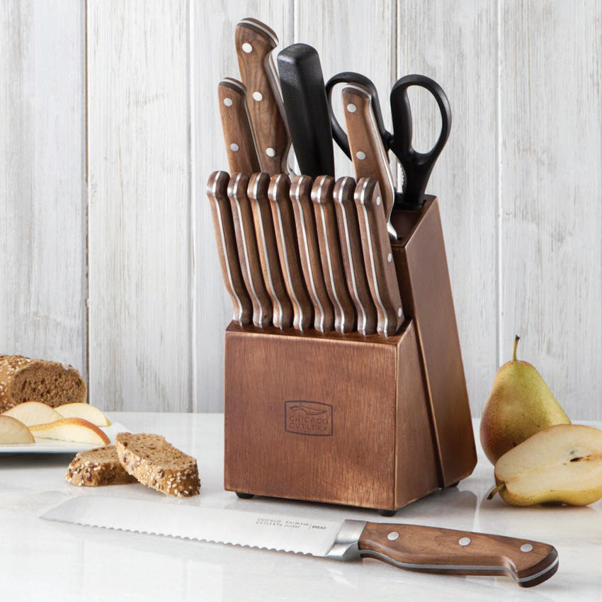 Satin finish high carbon stainless blade. Walnut handle. Storage block. Full tang. Includes: Chef's with 8" blade; Bread with 8" serrated blade; Utility with 5" blade; (8) Steak with 5" serrated blade; Paring with 3.5" blade; Kitchen shears with black polymer handle; Sharpening steel with black polymer handle. Boxed.
