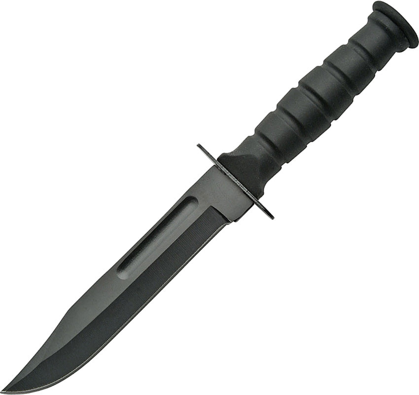 7 1/2" overall. 4 1/4" black finish stainless clip point blade. Black grooved rubber handle with stainless guard. Black nylon belt sheath.