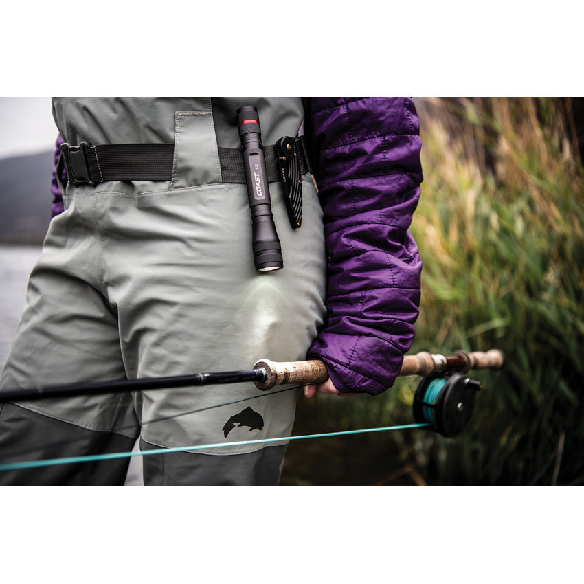 6.75" overall. Clip. Rechargeable. Water resistant. Impact resistant. Modes: High (370 lumens, 4h 30m runtime); Low (135 lumens, 17h runtime). 137m beam distance. Twist focus control. Quick-Cycle switch system. Ultra view flood. Bulls-eye spot. Dual power. Works with COAST ZITHION-X rechargeable battery (not included). Requires (2) AA batteries (included). Aluminum construction. Color: Black. Clam packed.