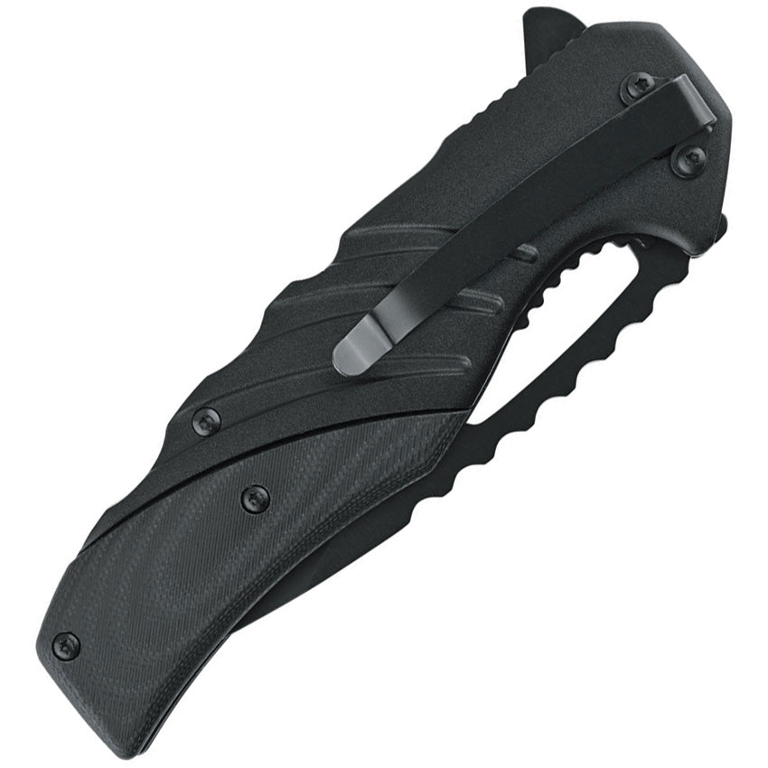 4.75" closed. 3.25" black finish 440 stainless blade. Black sculpted G10 handle. Pocket clip. Clam packed.