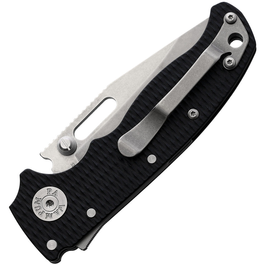 4" (10.16cm) closed. 3" (7.62cm) stonewash finish S35VN stainless clip point blade. Black G10 handle. Thumb stud. Thumb pull. Lanyard hole. Pocket clip.