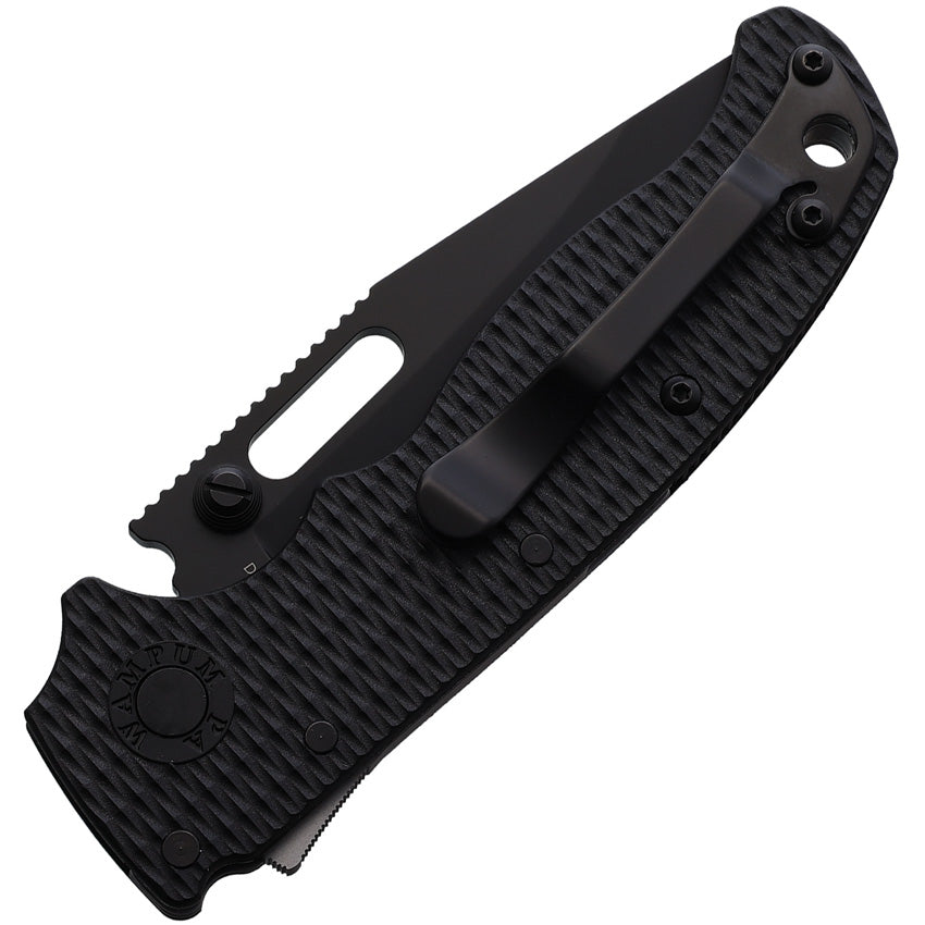4.38" (11.13cm) closed. 3.25" (8.26cm) black DLC coated D2 tool steel clip point blade. Black checkered G10 handle. Thumb stud. Thumb pull. Lanyard hole. Pocket clip. Comes in plastic tube.