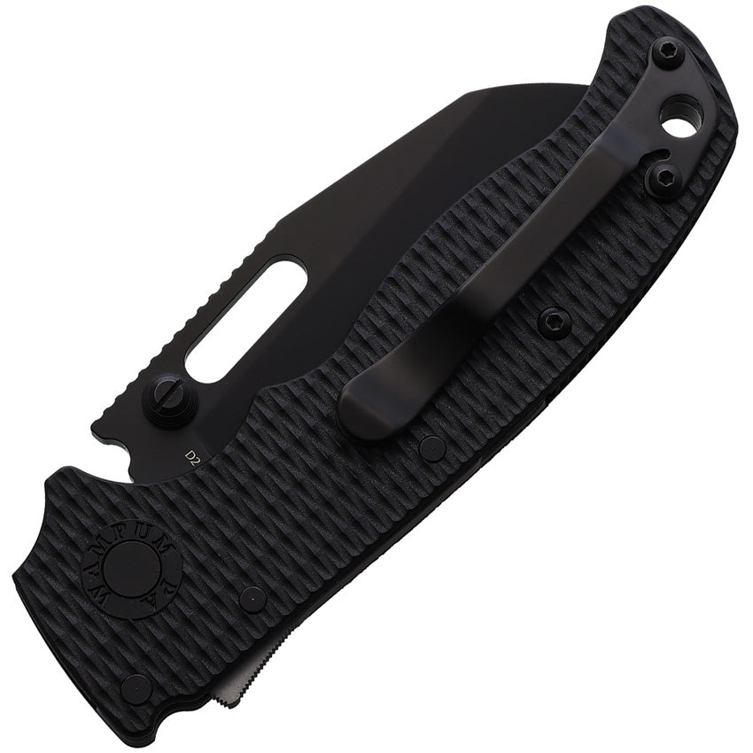 4.38" (11.13cm) closed. 3.25" (8.26cm) black DLC coated D2 tool steel Wharncliffe blade. Black checkered G10 handle. Lanyard hole. Pocket clip. Thumb stud. Thumb pull. Comes in plastic tube.