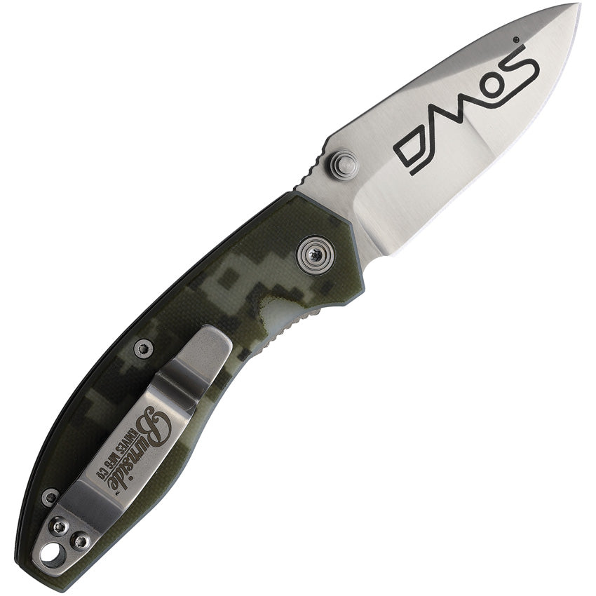 3.63" (9.22cm) closed. 2.5" (6.35cm) satin finish D2 tool steel blade. Camo G10 handle. Thumb stud. Lanyard hole. Pocket clip. Boxed.