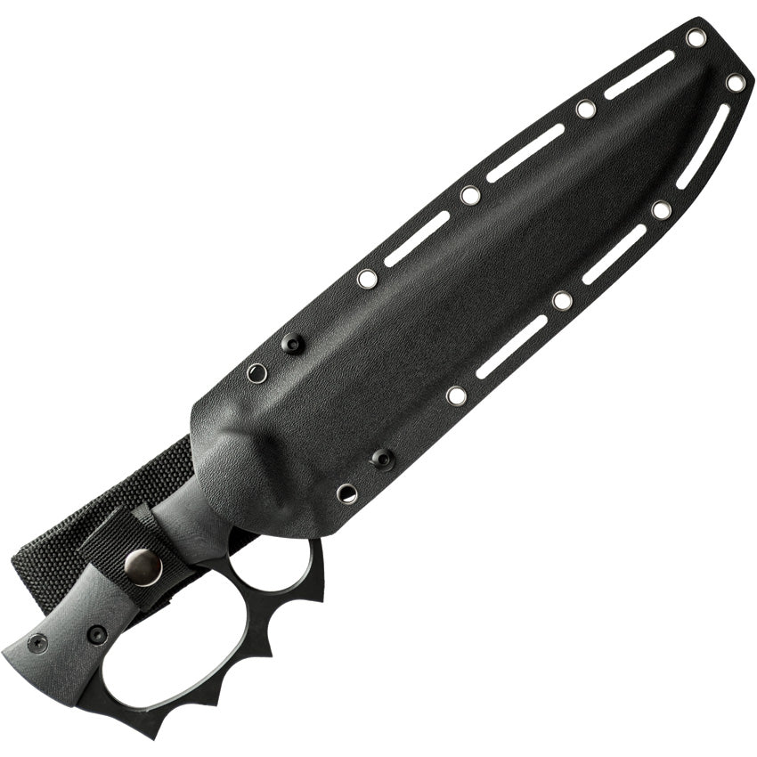 14.13" (35.89cm) overall. 8.88" (22.56cm) black oxide coated 9260 steel bowie blade. Black G10 handle. Full tang. Knuckle duster grip. Black Kydex MOLLE compatible belt sheath. Boxed.