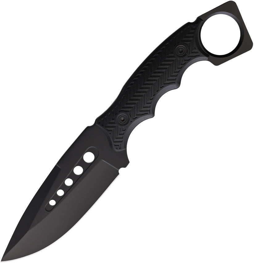 8.63" (21.92cm) overall. 4" (10.16cm) black finish 420C stainless blade. Black finger grooved synthetic handle. Finger ring. Full, extended tang. Black molded plastic belt sheath. Boxed.