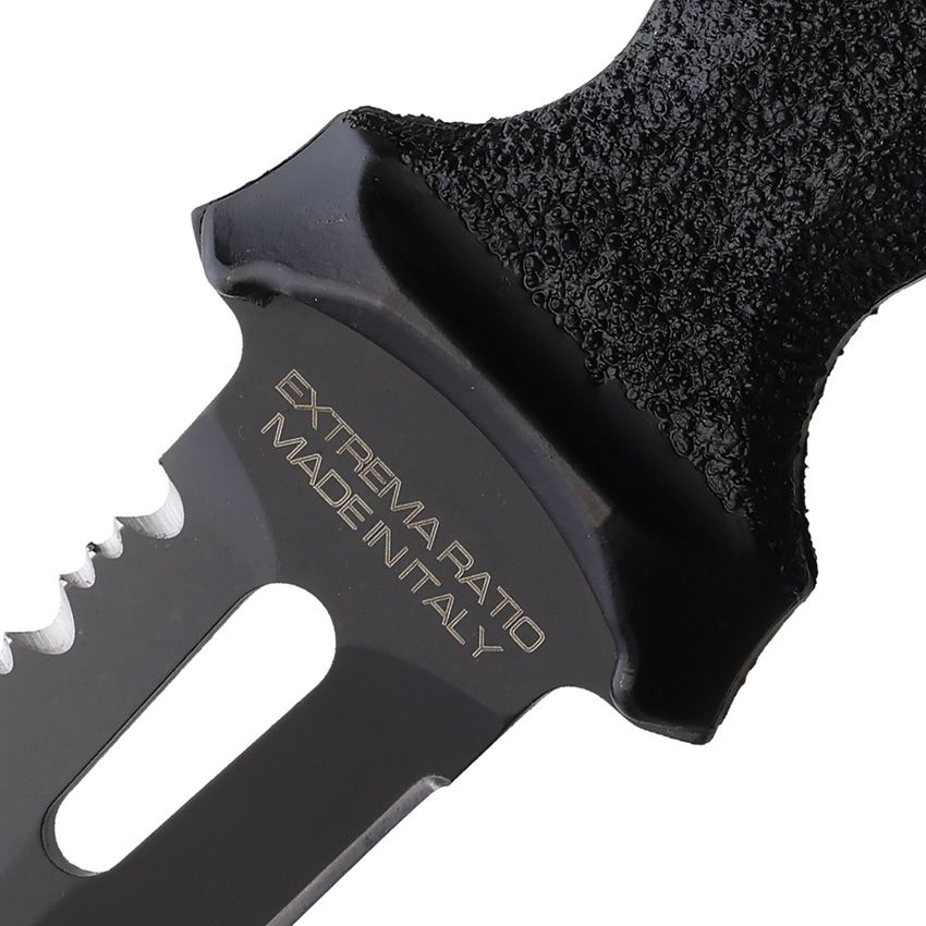 7.75" (19.69cm) overall. 3.25" (8.26cm) black MIL-C-13924 burnished partially serrated Bohler N690 stainless blade. Black rubberized nylon handle. Clipped blade tip allows use as a prying lever. Sheath is designed to allow for multiple mounting options, to equipment or user: it can be attached to the VIS, ankle-fastened, arm-fastened, or attached to the weights belt through the Extrema Ratio BELT-CLIP system (not included). Black Kydex sheath.