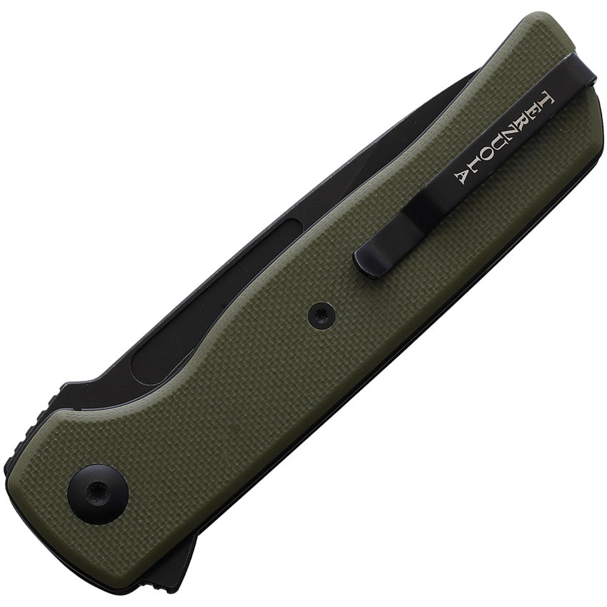 3.75" (9.53cm) closed. 2.88" (7.32cm) black finish Nitro V steel blade. OD green G10 handle. Extended tang. Pocket clip. Designed by Bob Terzuola. Boxed.