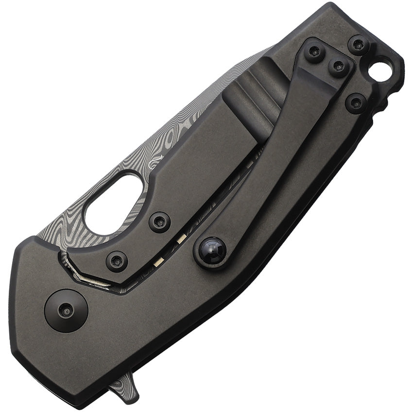3.5" (8.89cm) closed. 2.5" (6.35cm) Damascus steel blade. Carbon fiber handle with black titanium back handle. Extended tang. Lanyard hole. Pocket clip. Thumb pull. Boxed.