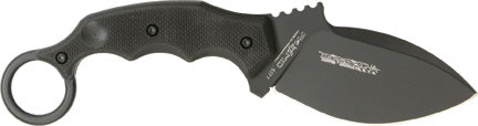 8 3/4" overall. 3 3/4" N690Co Cobalt Vanadium stainless blade with black non-stick coating. Black G-10 handles. Full tang. Ring pommel. Black Kydex sheath.
