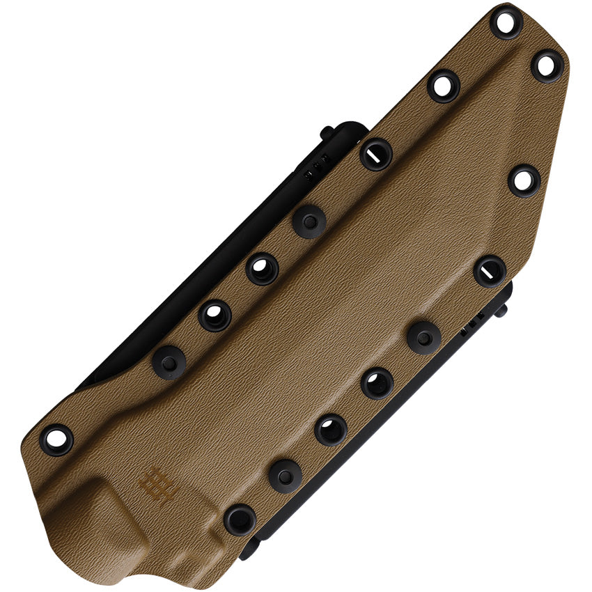 11.75" (29.85cm) overall. 6.75" (17.15cm) dark earth Teflon coated partially serrated Bohler K110 stainless tanto blade. Dark Earth sculpted G10 handle. Full, extended tang. Lanyard hole. Black Kydex MOLLE compatible belt sheath. Boxed.
