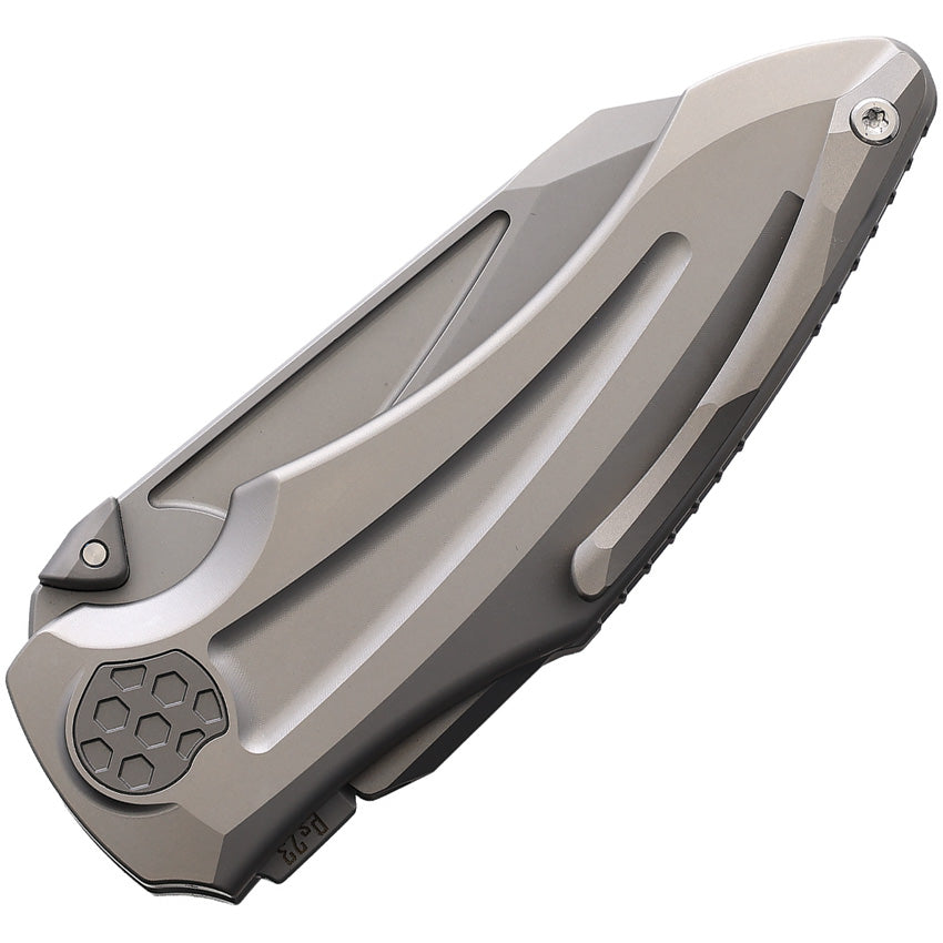 4" (10.16cm) closed. 3.25" (8.26cm) stonewash finish CPM-20CV stainless blade. Gray sand blast finish titanium handle. Thumb stud. Extended tang. Pocket clip. Wooden storage box.
