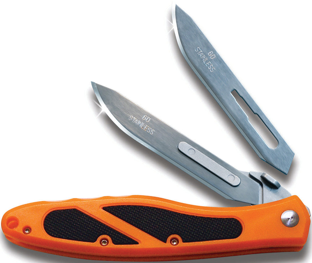 Quik-Change Skinner. 4 1/4" closed linerlock. 2 3/4" skinner blade with dual thumb studs. Includes 12 additional Quik-Change "easy-on, easy-off" stainless replacement blades. Blaze orange ABS plastic handles. Front handle has checkered black rubber grip insert. Lanyard hole. Removable stainless pocket clip. Comes with bonus black nylon belt sheath. Hang packaged.