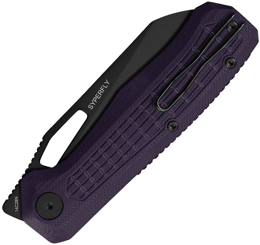 4.88" (12.4cm) closed. 3.75" (9.53cm) black finish 14C28N Sandvik stainless sheepsfoot blade. Purple G10 handle. Thumb pull. Pocket clip. Boxed.
