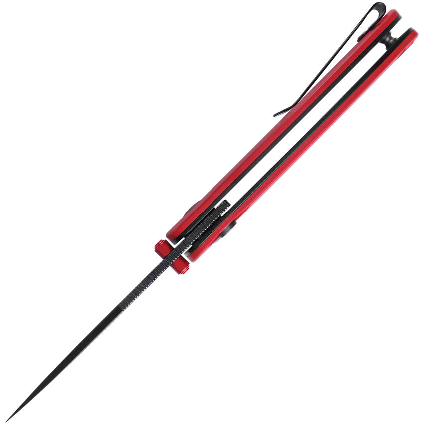 - The red G10 handle provides a comfortable and secure grip, even in wet conditions.