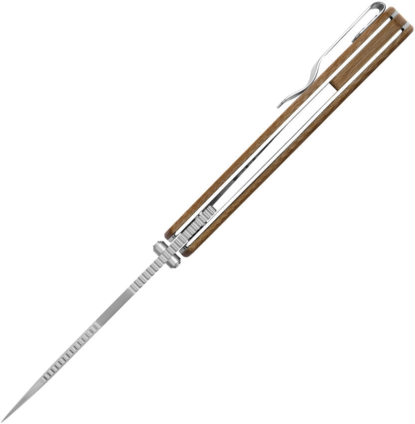 4.58" (11.63cm) closed. 3.5" (8.89cm) satin finish Nitro V steel drop point blade. Brown micarta handle. Thumb stud. Pocket clip. Brass inlay shield and pivot collar. Boxed.