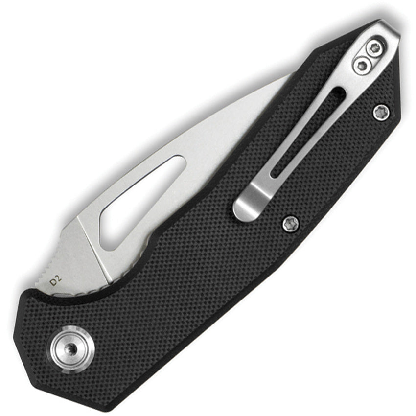 4.13" (10.49cm) closed. 3.13" (7.95cm) stonewash finish D2 tool steel blade. Black G10 handle. Thumb pull. Pocket clip. Boxed.