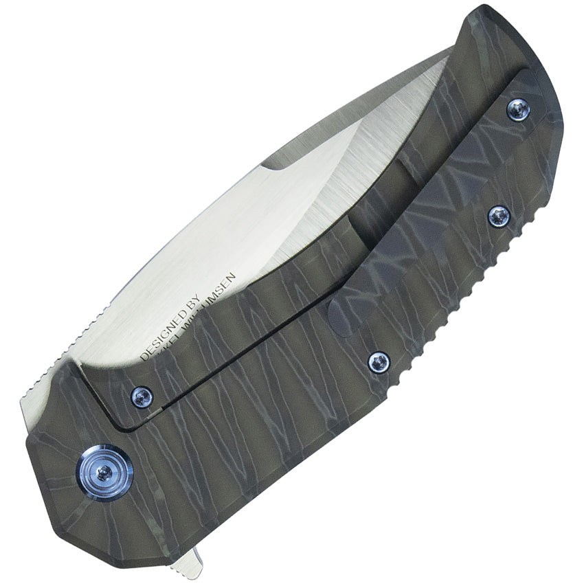 4.63" (11.76cm) closed. 3.38" (8.59cm) satin finish Bohler M390 stainless drop point blade. Flame anodized titanium handle. Extended tang. Pocket clip. Boxed.