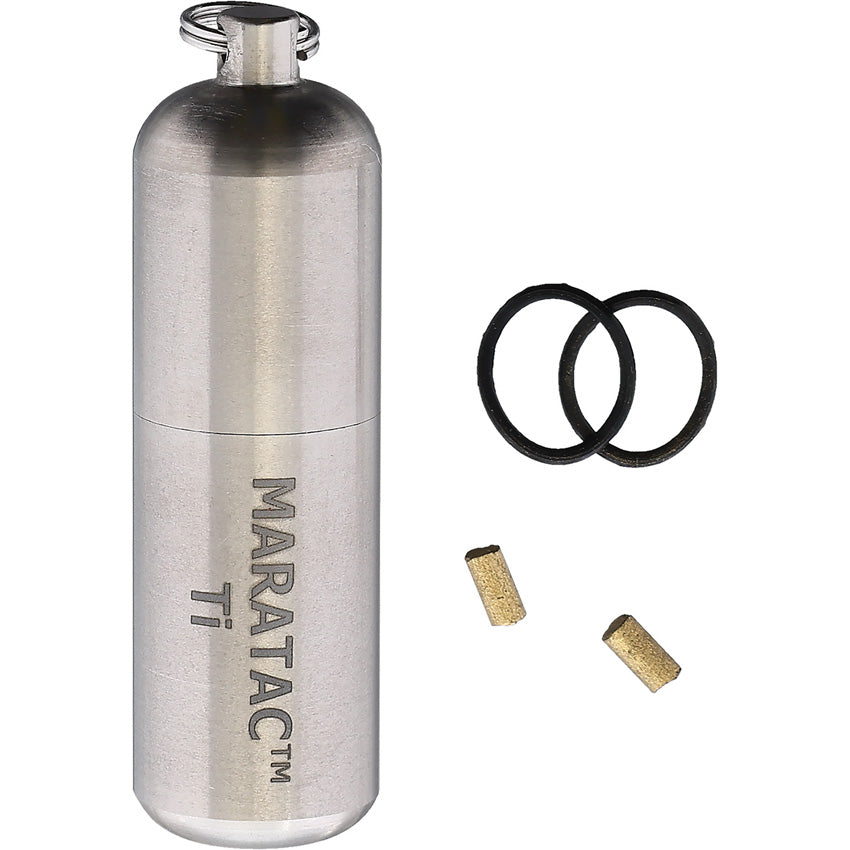 Dimensions: 1.9" x 0.5". Solid brass lighter insert. Removable insert allows it to be used as a waterproof vial. Comes with spare flints. O-ring sealed. Keyring. Grade 5 titanium construction. Bulk packed.