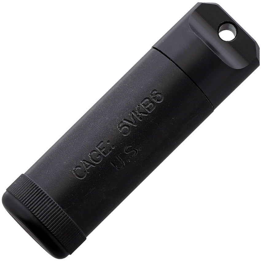 2.5" overall. Lid is secured via flange to cap seal (internal o-ring). Waterproof. Holds AA battery (not included). Can also be used for: geo-caching, emergency cash stash, water purification tablet storage, pill storage, and more. Lanyard hole. Delrin construction. Color: Black. Bulk packed.