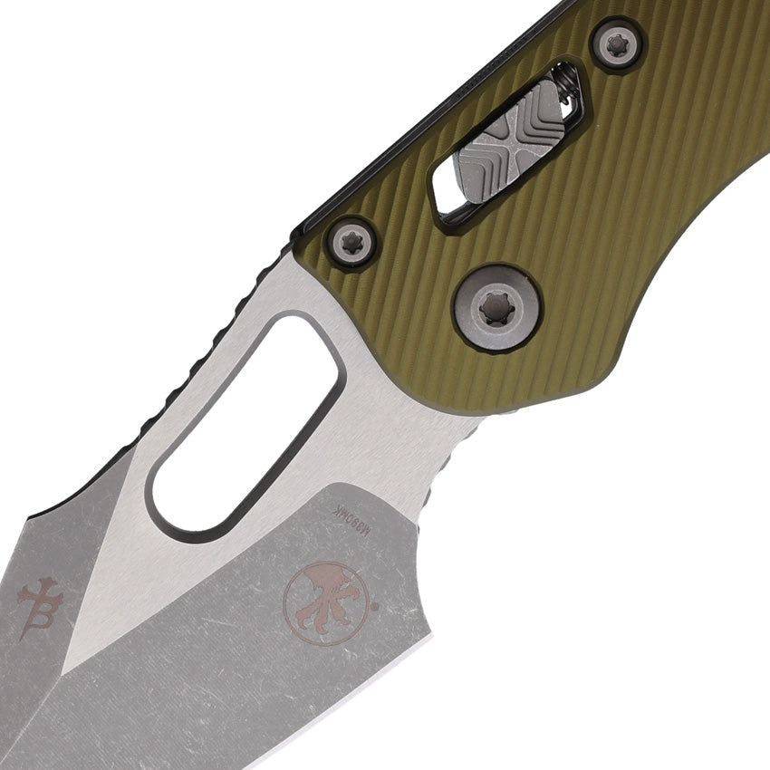 5" (12.7cm) closed. 3.75" (9.53cm) Apocalyptic finish Bohler M390MK stainless blade. OD green fluted aluminum handle. Thumb pull. Lanyard hole. Pocket clip. Boxed.