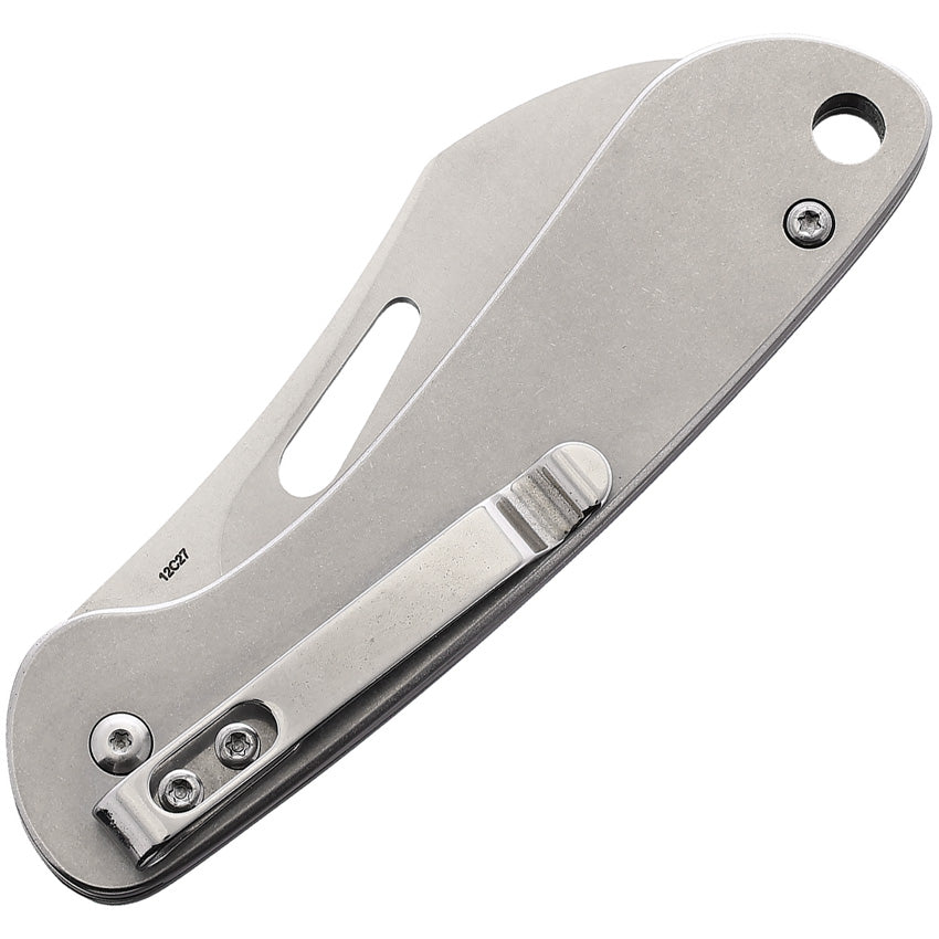 3.75" (9.53cm) closed. 2.75" (6.99cm) stonewash finish 12C27 Sandvik stainless blade. Stonewash finish stainless handle. Lanyard hole. Thumb pull. Boxed.