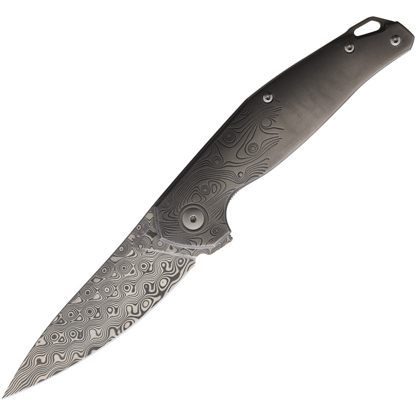 Goccia limited edition linelock design by Jens Anso. Damasteel rose blade. Titanium sandblasted handle.