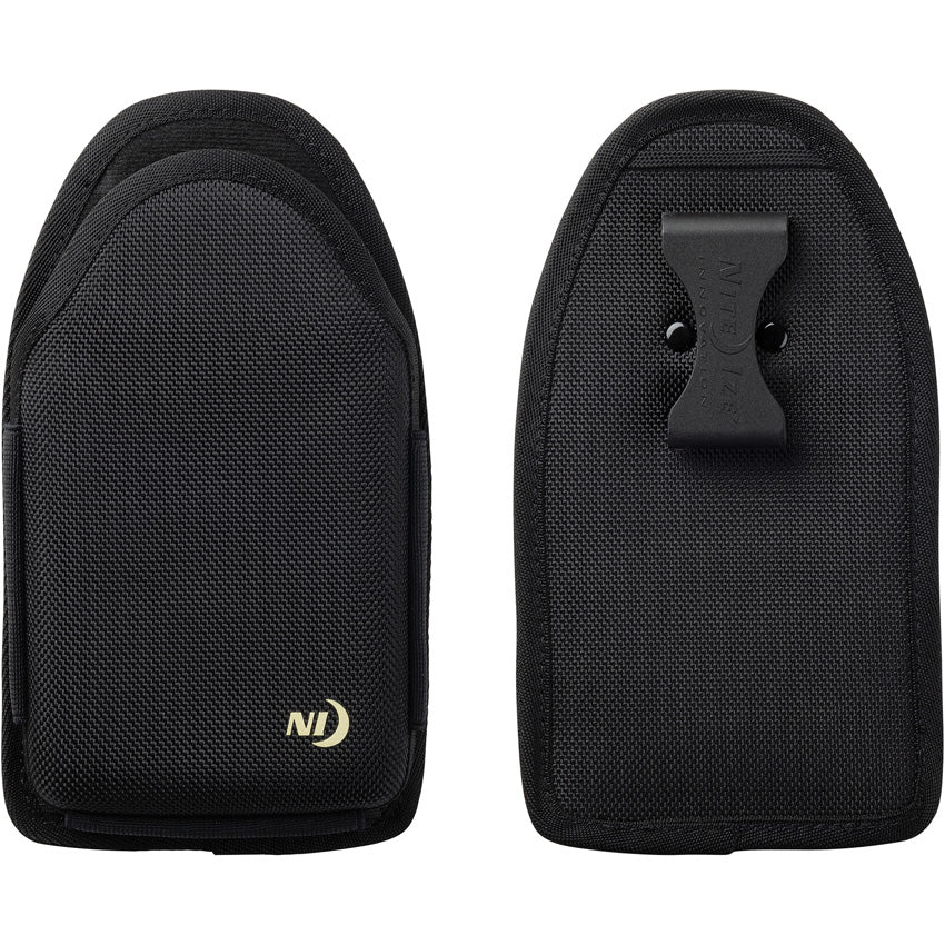 Size: XXL. Universal Quickslide holster allows for easy phone access. Fits 7.6" x 3.5". Rugged fixed position clip. Internal pocket holds credit cards and more. Expandable design fits phone with or without case.