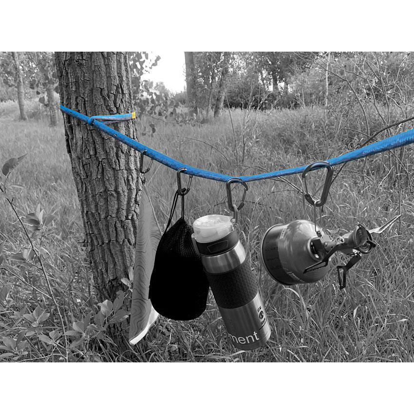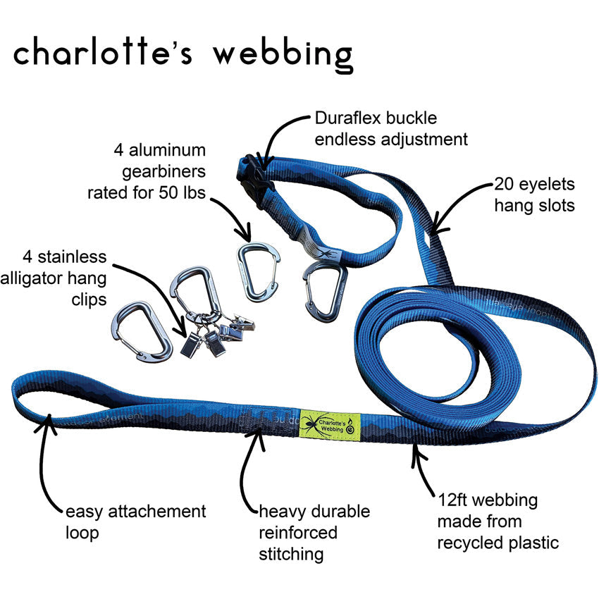 Includes: Webbing made from recycled plastics; (20) Eyelets/hanging slots; (4) Gearbiner rated for 50lb; (4) Stainless alligator clips. 12 foot length. Hang packaged.
