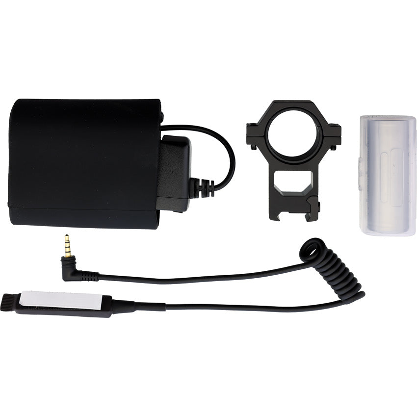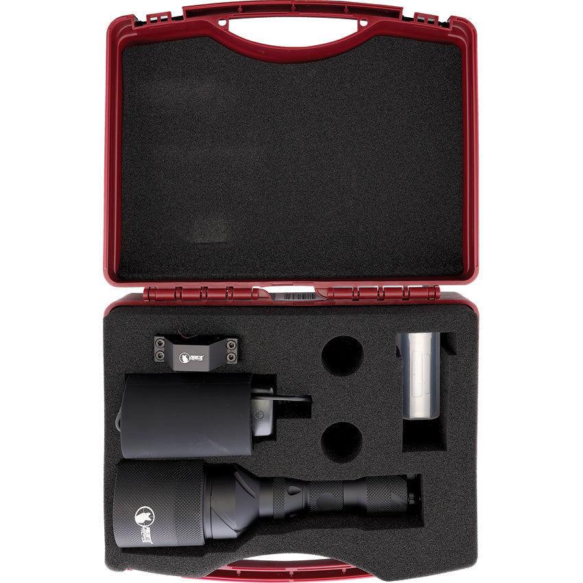 8.5" overall. Waterproof. Shockproof. Weight: 17oz. Premium infrared bulb 860NM/2000MW. Adjustable focus. Intensity control. Halo shield. 100% silent switches. Adjustable rail mount. Rechargeable. Up to 800 yards of beam throw. Kit includes: Coyote Reaper XXL flashlight, Infrared emitter module, Silent intensity control on/off switch, and Battery charger. Aluminum construction. Color: Matte black. Hardside carrying case.