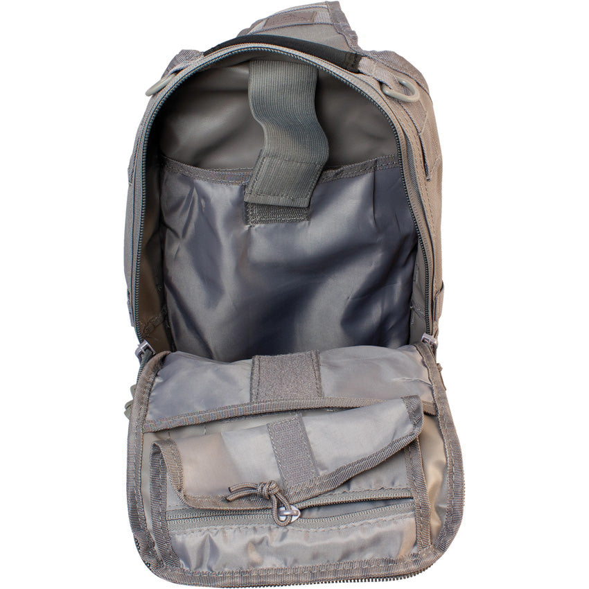 11.5L capacity. Ambidextrous shoulder strap. Quick release buckle on main strap. On-the-go style carry handle. Snap-closure concealed carry sleeve on back panel. Two external pockets. Master compartment houses a slip pocket with touch-fastener closure. Master compartment also accomodates an iPad or similar tablet. MOLLE webbing platform on front and shoulder strap. Color: Tornado gray. 600D polyester construction. Bulk packed.