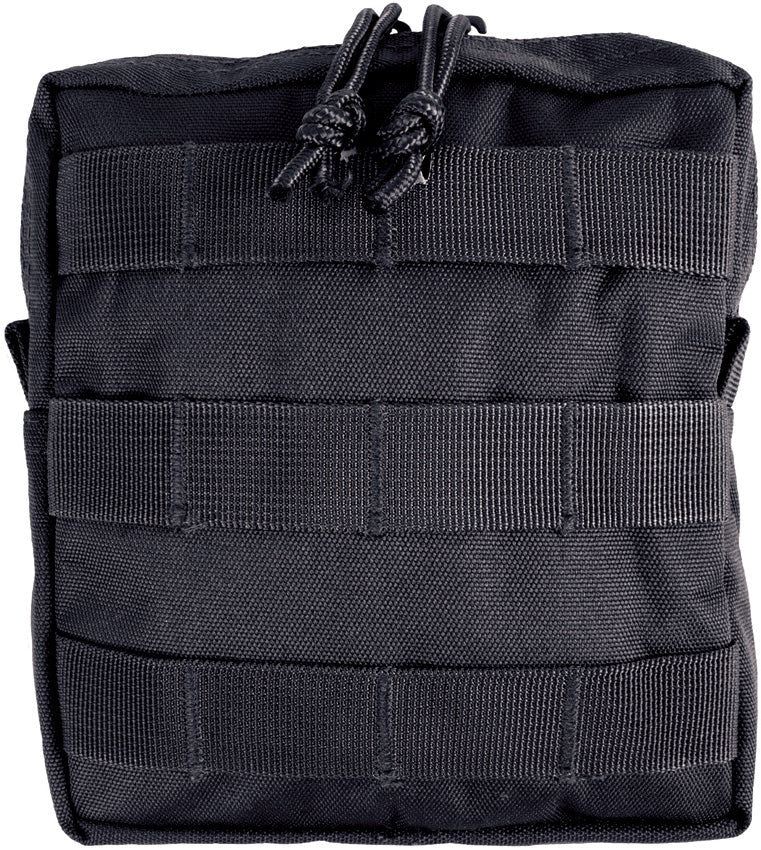 Touch-fastener closure slip pocket. Internal elastic loops to secure small items or magazines. Reinforced MOLLE attachment points. 600D polyester construction. Color: Black. Hang packaged.