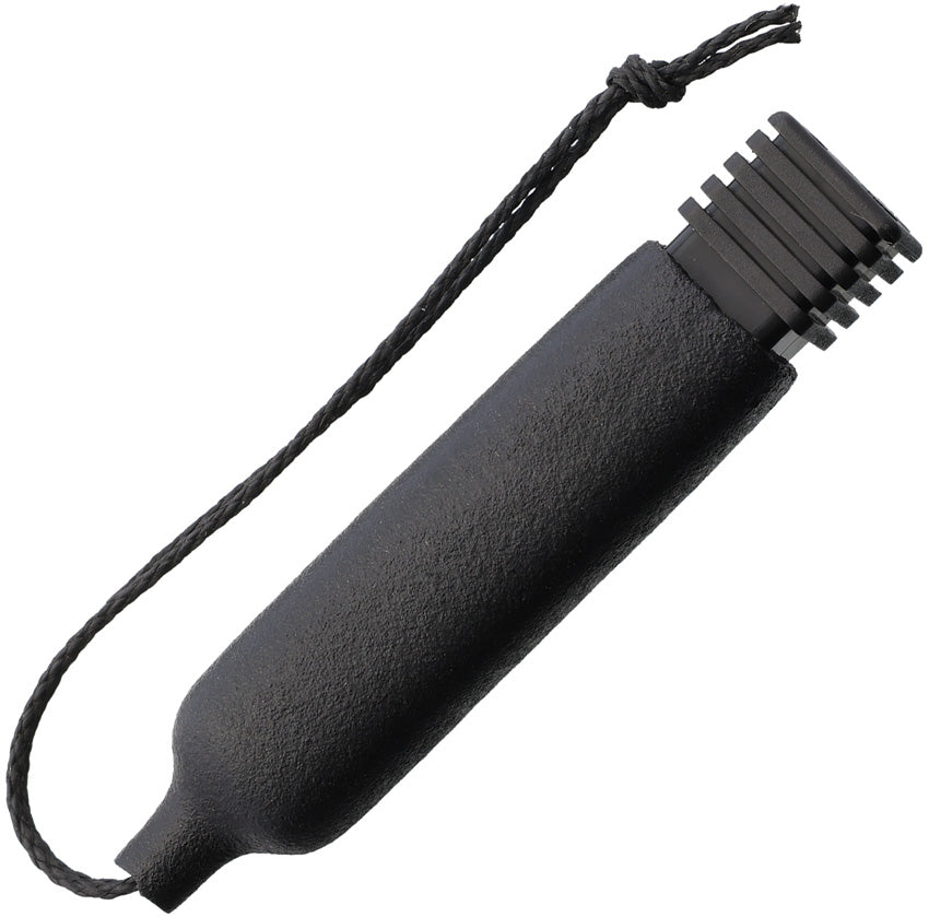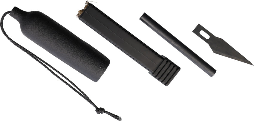 2.75" overall. Includes: 2" ferrocerium rod; (2) 2" lengths of waxed jute; razor blade striker; Kevlar cord. HDPE construction. Color: Black. Bagged.