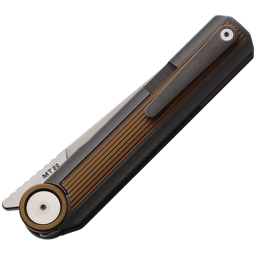 4.25" (10.8cm) closed. 3.25" (8.26cm) stonewash finish Bohler M390 stainless tanto blade. Bronze and gray titanium handle. Extended tang. Pocket clip. Storage case.