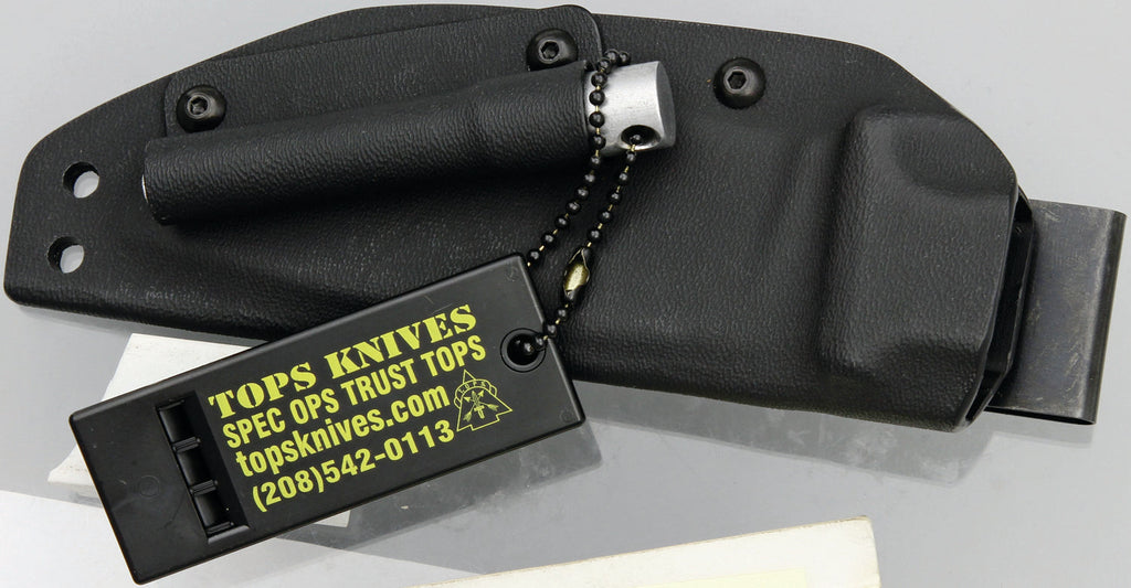8 1/2" overall. 4 1/4" 1095 high carbon steel blade with black traction coating. Full tang. Tan canvas micarta handles with hunter orange composition inlays. Hunter orange lanyard. Molded black Kydex sheath with multi-position boot/belt clip. Comes with firestarter and survival whistle.